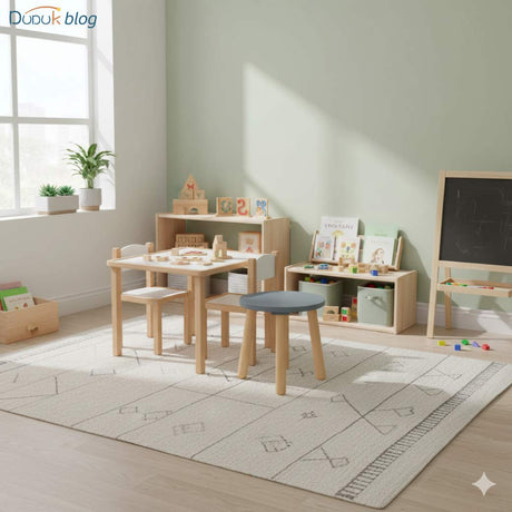 El banco infantil azul no solo añade estilo a la habitación, también impulsa el desarrollo, la autonomía y la seguridad del niño.