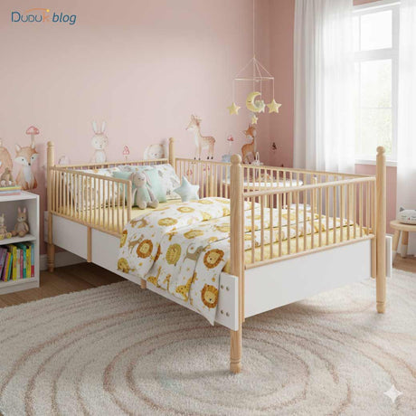 Una cama cuna con 2 burós es un mueble evolutivo y funcional que integra una cuna con dos mesas laterales —o burós— que sirven tanto como espacio de almacenamiento como soporte decorativo.