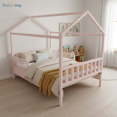 Coloca guirnaldas de luces o cortinas en camas tipo casita para un ambiente acogedor.