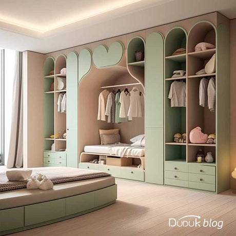 Además de la funcionalidad, los closet modernos con estilo minimalista deben ser visualmente atractivos. La incorporación de líneas limpias, tonos neutros y elementos naturales crea un espacio de almacenamiento elegante y contemporáneo que se adapta perfectamente a la personalidad en crecimiento de los niños.