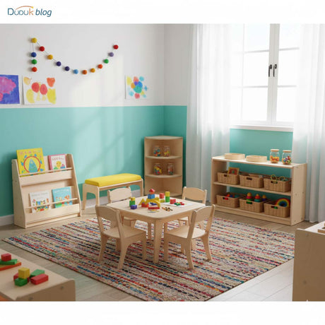 El mobiliario ergonómico es fundamental. Las mesas DUDUK están fabricadas en madera natural, con bordes suaves y proporciones adaptadas a la altura infantil, favoreciendo una postura correcta.