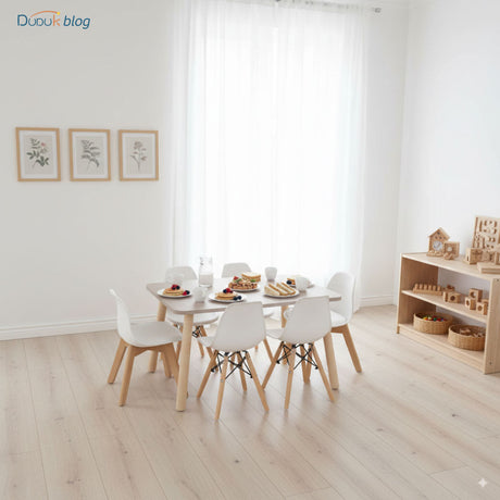 Las mejores opciones de mesas y sillas infantiles están fabricadas en madera natural o MDF de alta calidad, con acabados no tóxicos y bordes redondeados para mayor protección. Así, además de ser visualmente atractivas, garantizan durabilidad y seguridad.