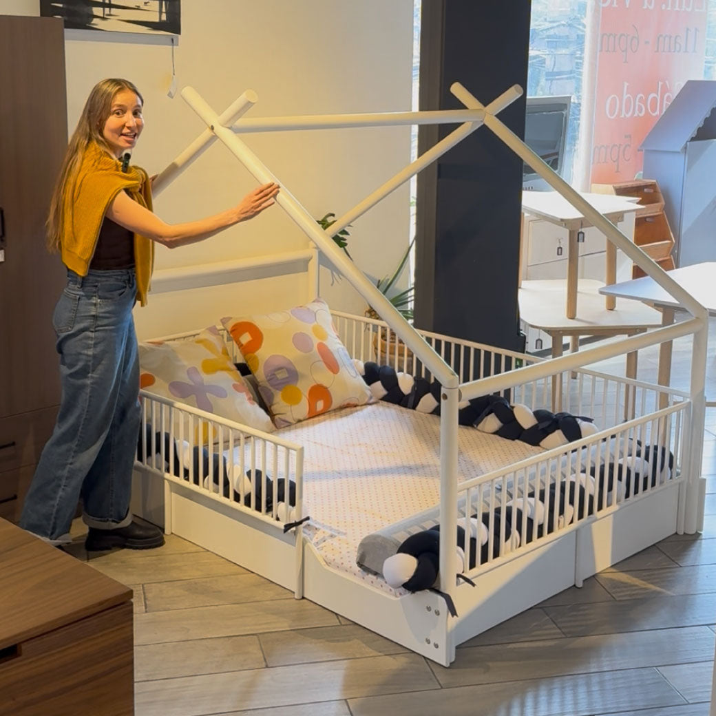 | Descripción: cama cuna montessori | Elige la cama chalet en tamaño individual, matrimonial o queen. Remueve los barandales a los 8 años y a los 10 años remueve la estructura de chalet y obtén un cama a ras del suelo. Haz una recámara montessori con una cama moderna para niños. |
