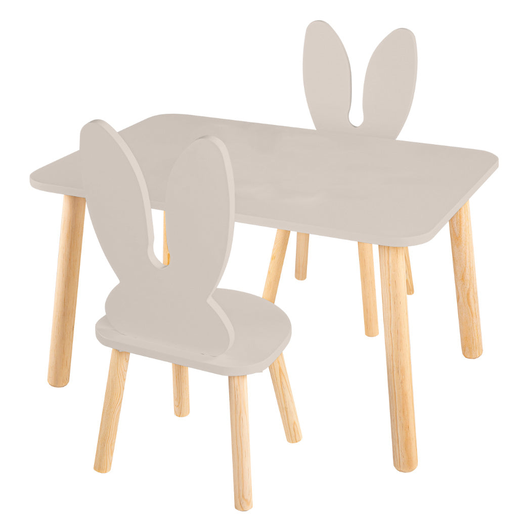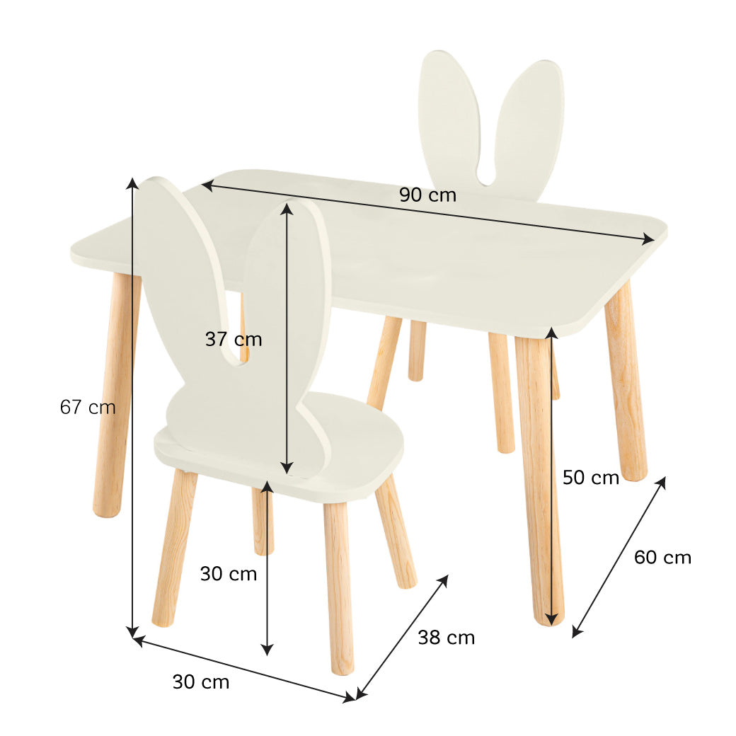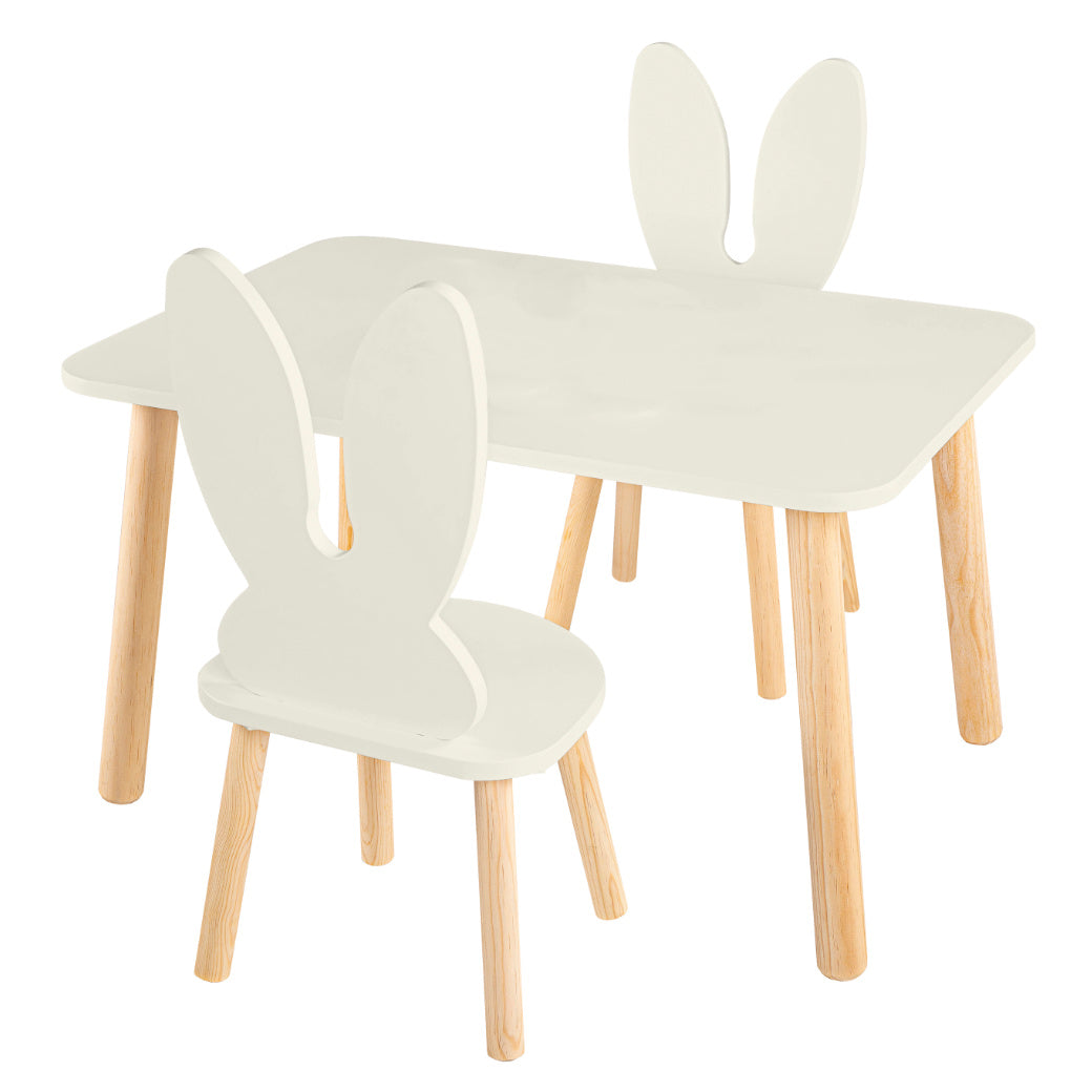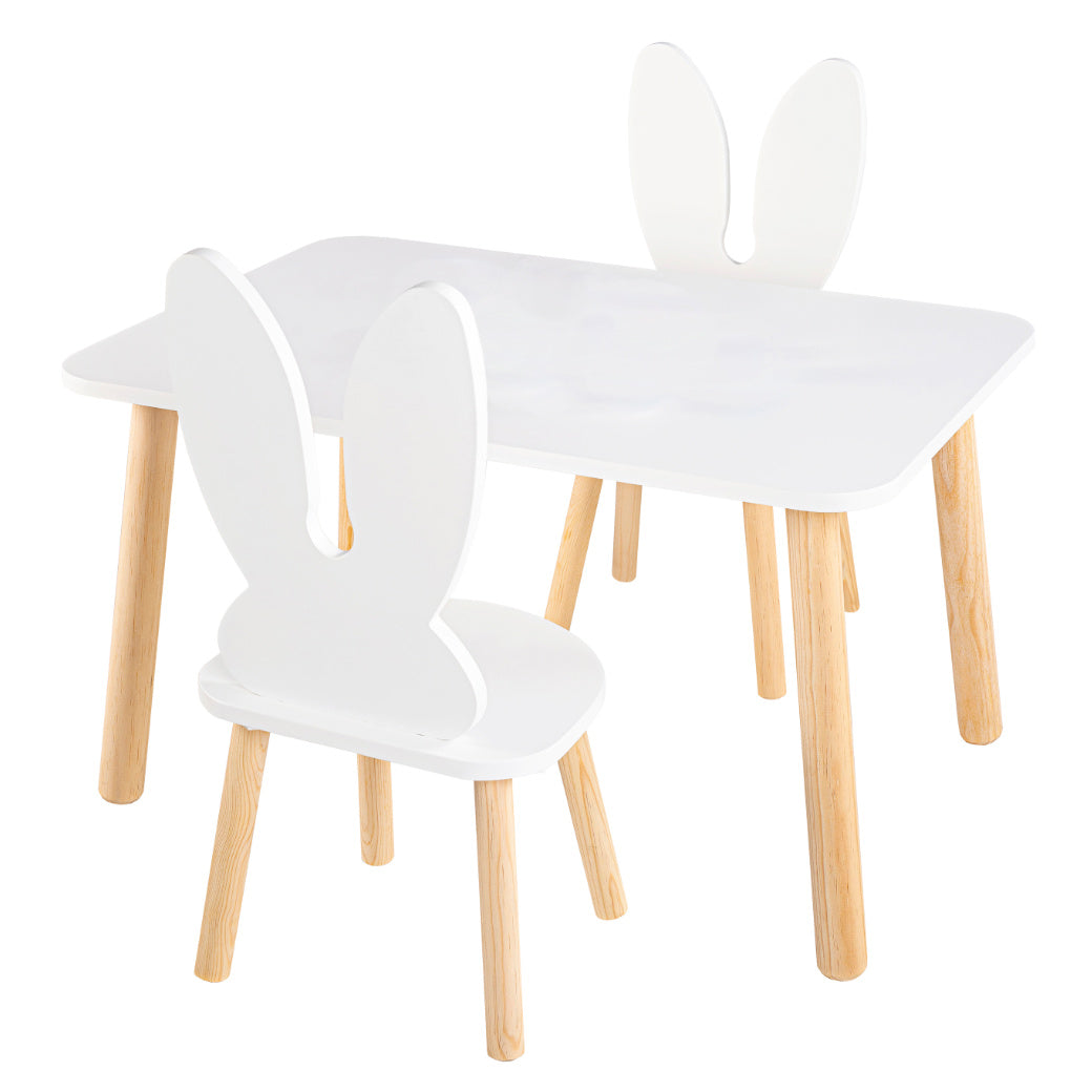 La Mesa Rectangular con 2 Sillas Conejo es perfecta para que los niños disfruten actividades como jugar, colorear, leer o tomar snacks de forma cómoda y segura. Este juego de mesa y sillas para niños de madera tiene un diseño moderno y sencillo que se adapta fácilmente a cualquier habitación infantil. Las sillas con respaldo de orejitas de conejo le dan un toque tierno que encanta a los pequeños.
