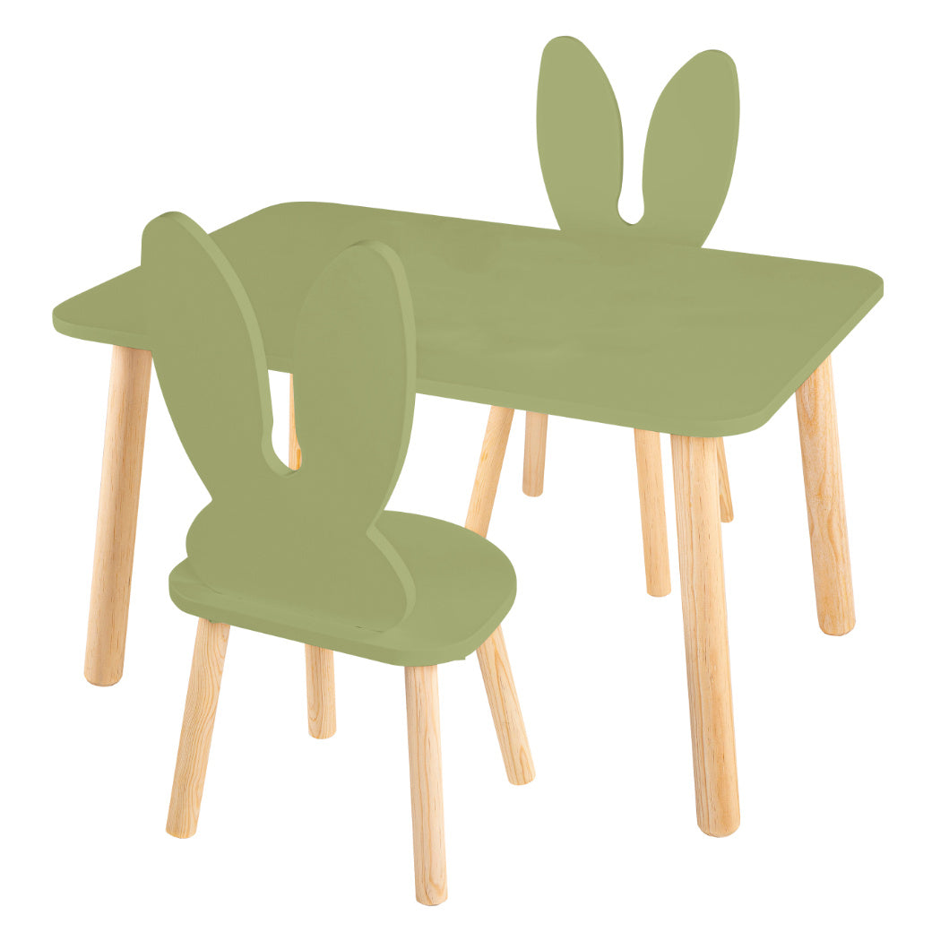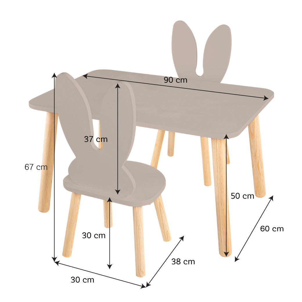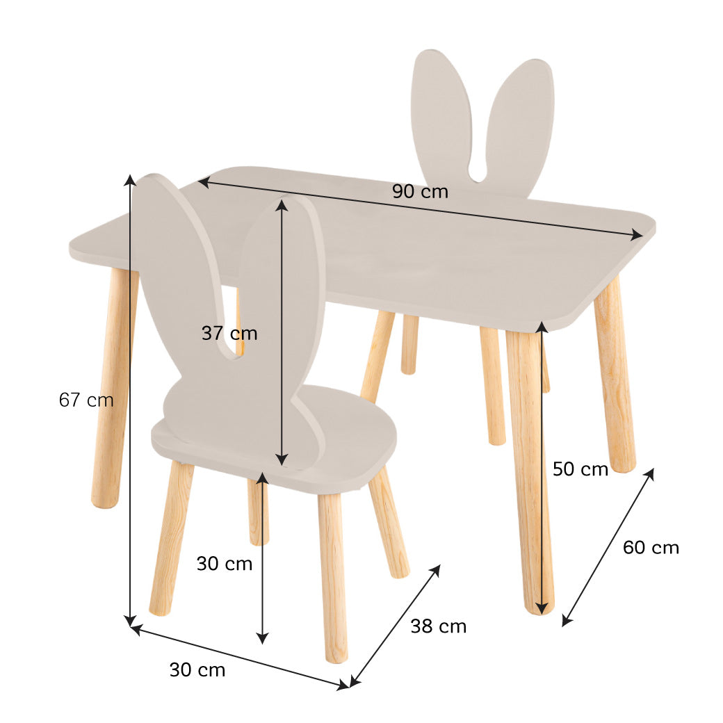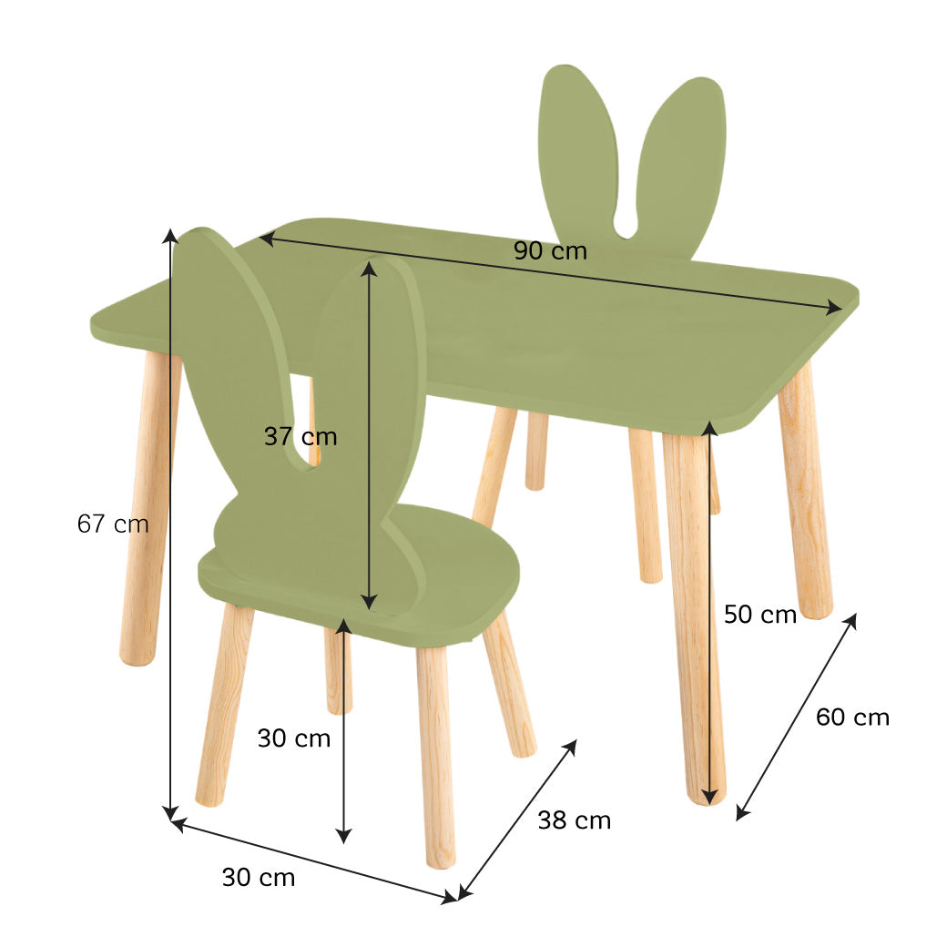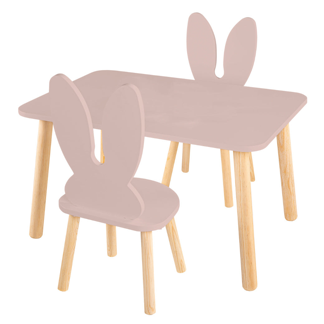 La Mesa Rectangular con 2 Sillas Conejo es perfecta para que los niños disfruten actividades como jugar, colorear, leer o tomar snacks de forma cómoda y segura. Este juego de mesa y sillas para niños de madera tiene un diseño moderno y sencillo que se adapta fácilmente a cualquier habitación infantil. Las sillas con respaldo de orejitas de conejo le dan un toque tierno que encanta a los pequeños.