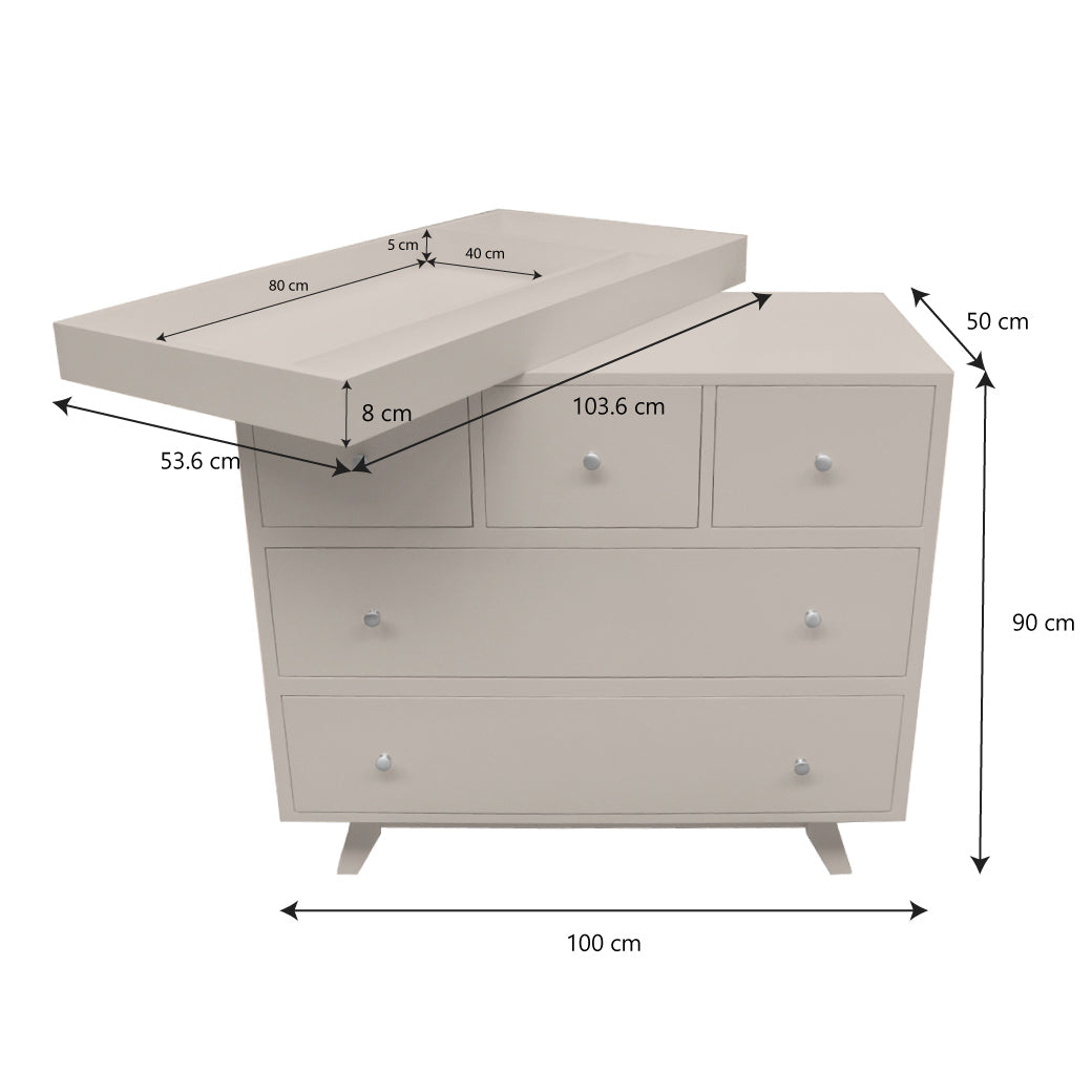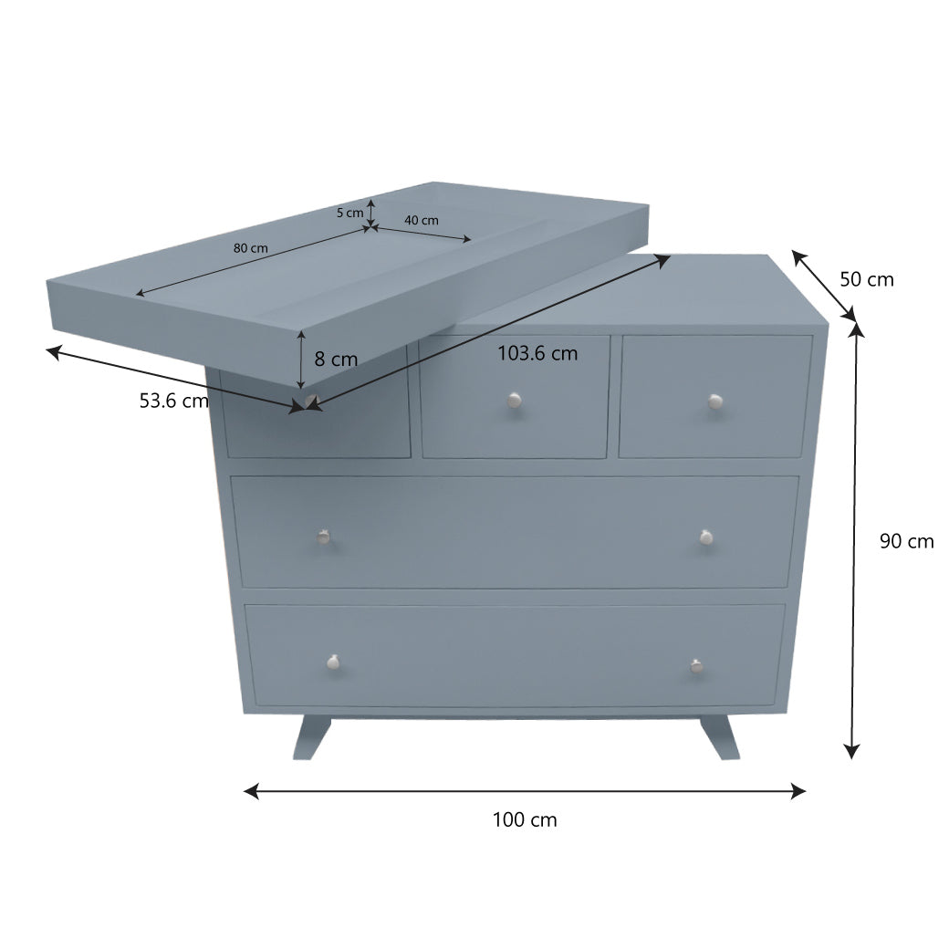 Cómoda: • Largo: 100 cm • Ancho: 50 cm • Alto: 90 cm Charola: Largo: 100 cm • Ancho: 50 cm • Alto: 90 cm Medidas Colchón Charola: • Largo: 80 cm • Ancho: 40 cm • Alto: 8 cm • Alto interior donde descansa colchón: 5.5 cm |