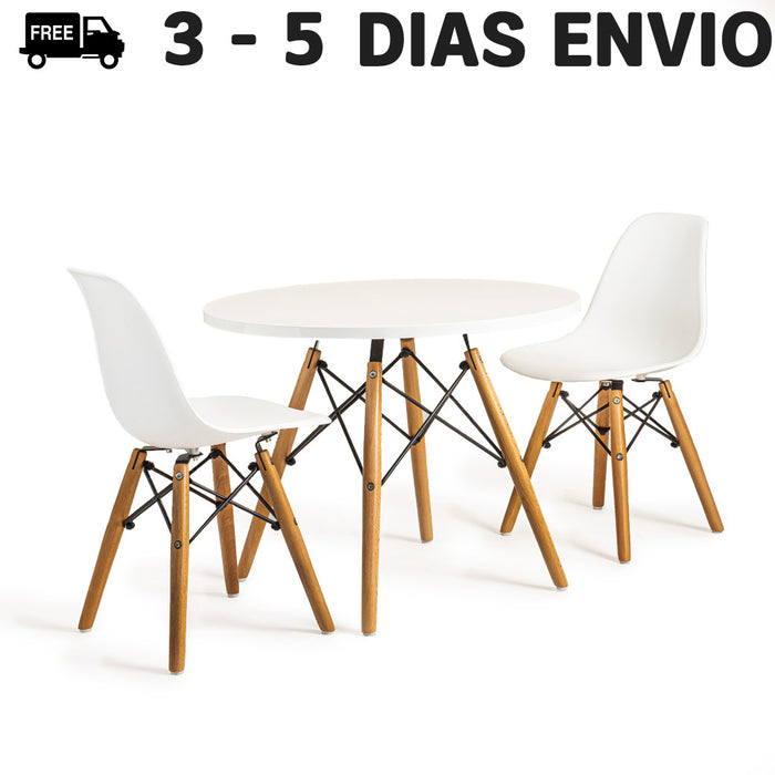 Dos sillas y mesa eames, para niñas y niños, color blanco diseñados por Ray Eames y su esposo Charles en 1948. El comedor eames se ha convertido en un mueble icónico, reconocible y utilizado en la decoración de interiores al decorar una recamara infantil. |