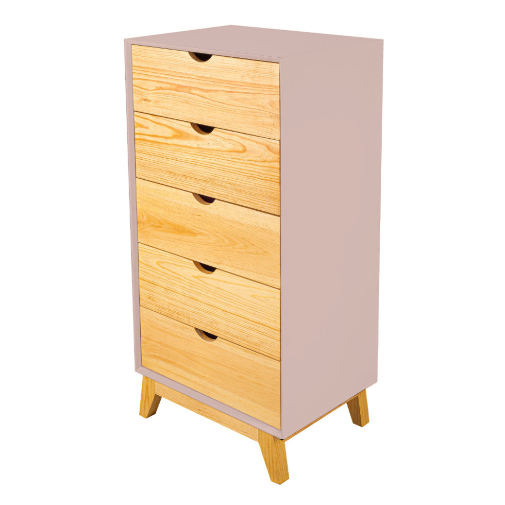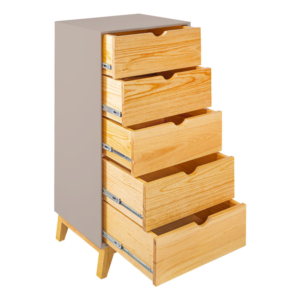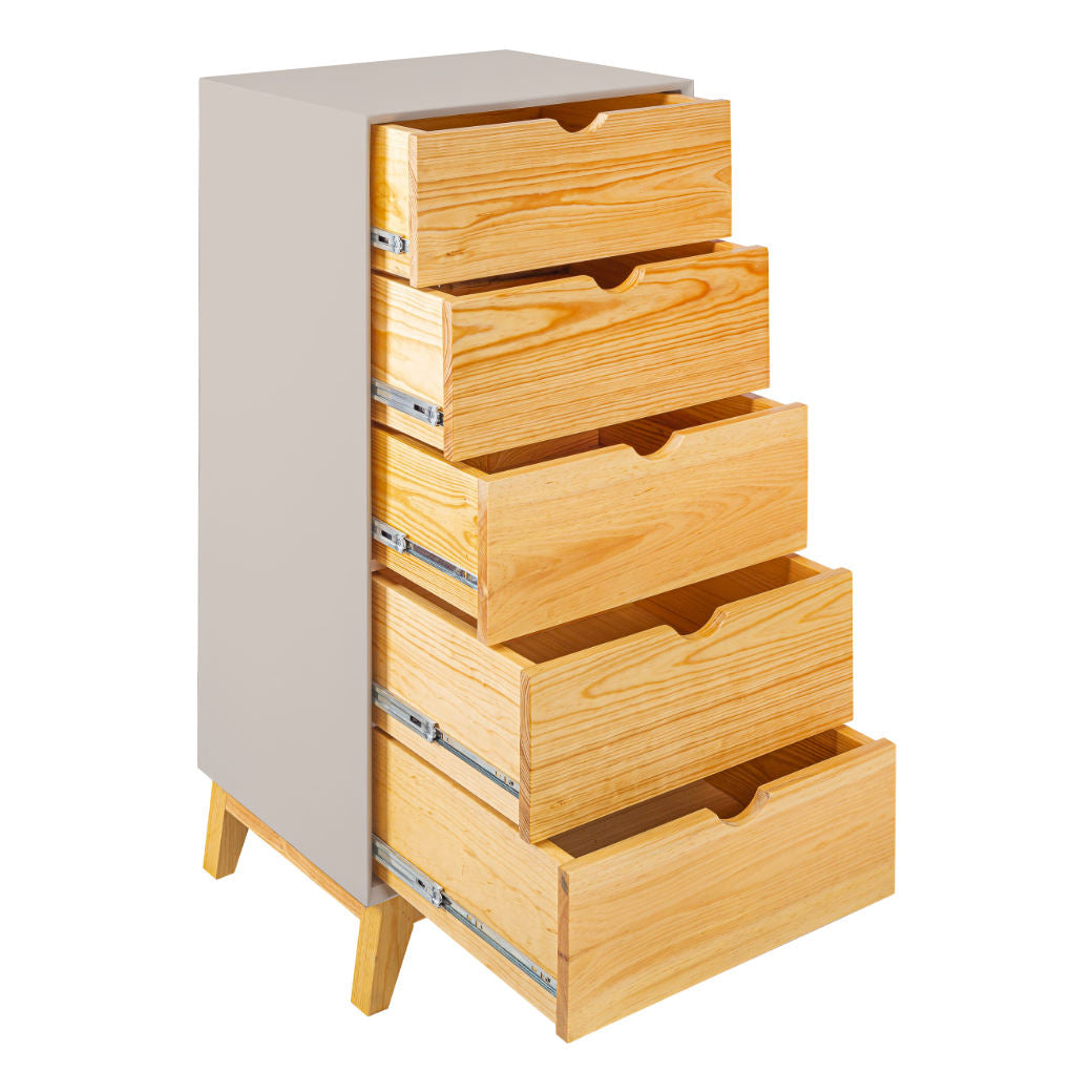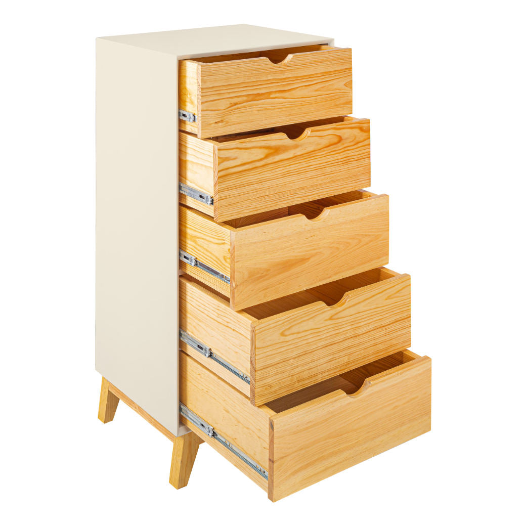 El Chiffonier Valencia es perfecto para mantener todo ordenado sin esfuerzo. Su diseño vertical aprovecha el espacio al máximo, con cajones en madera natural que aportan calidez y estilo al cuarto. Sus cinco cajones amplios y prácticos te permiten guardar ropa, accesorios o incluso juguetes, mientras que las patitas de madera elevan el mueble lo suficiente para que el espacio se vea más ligero y sea fácil limpiar. Disponible en 7 colores que combine con tu espacio y darle un toque personal.