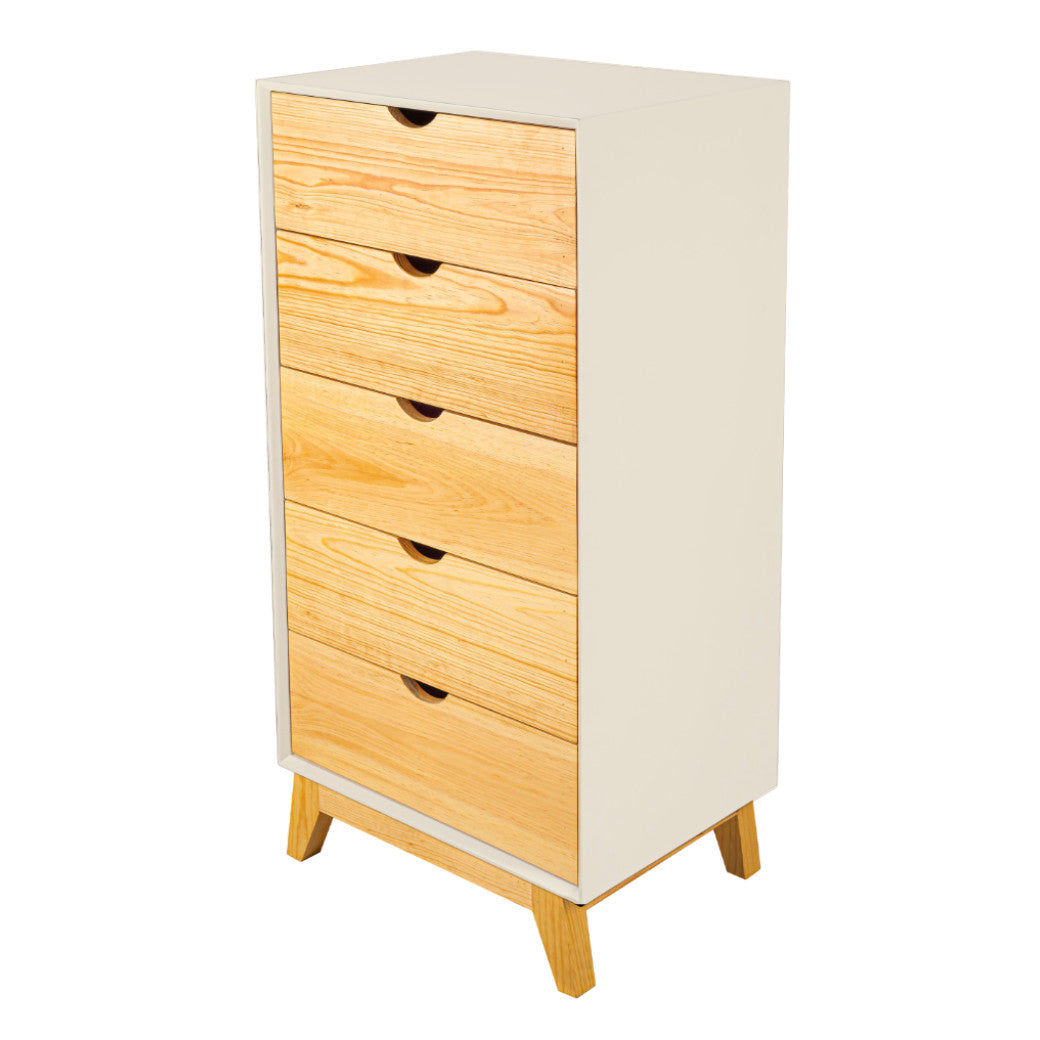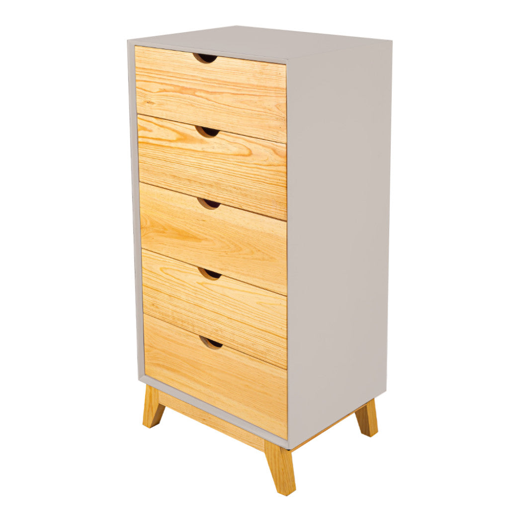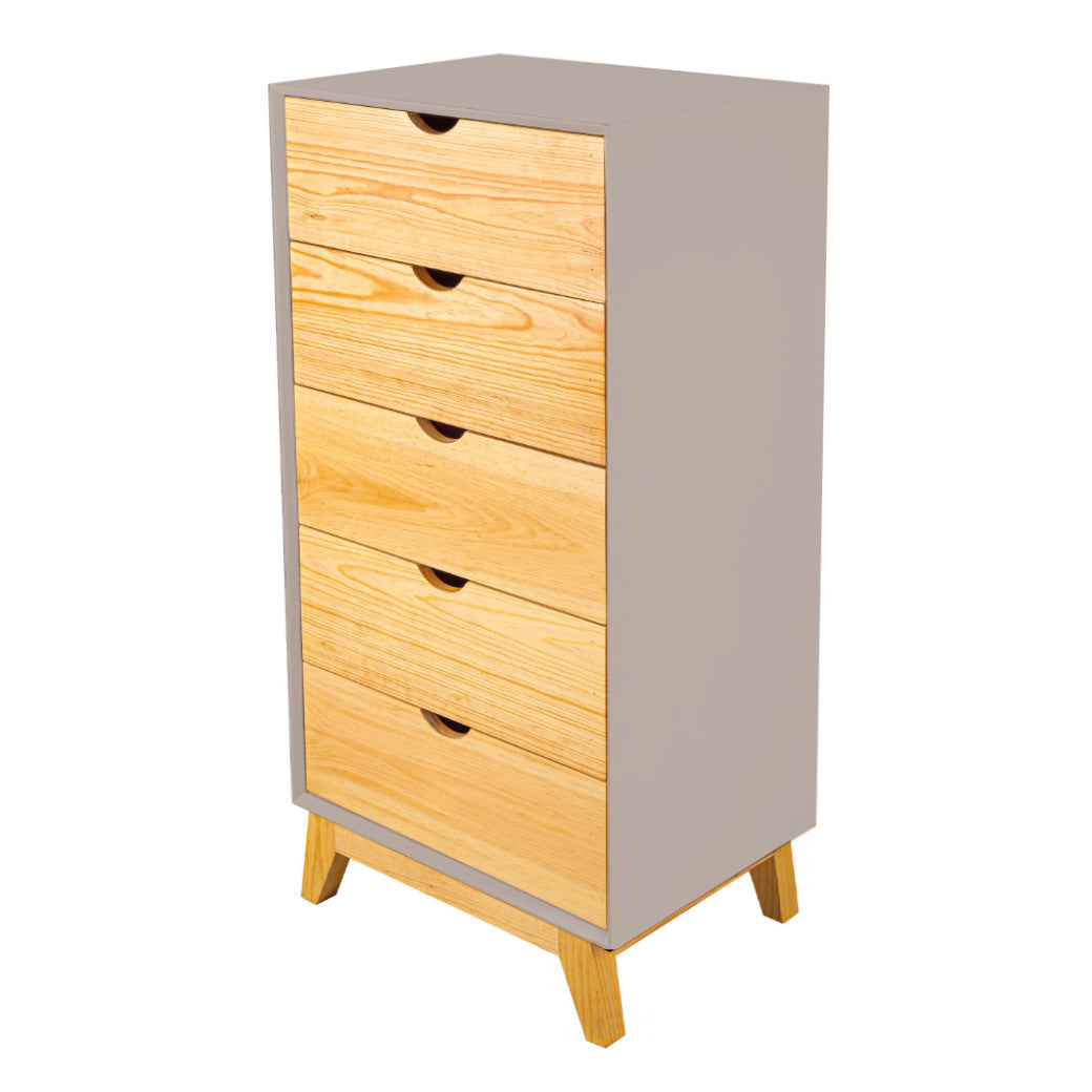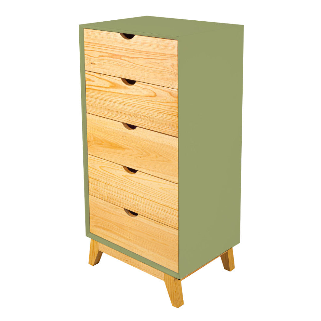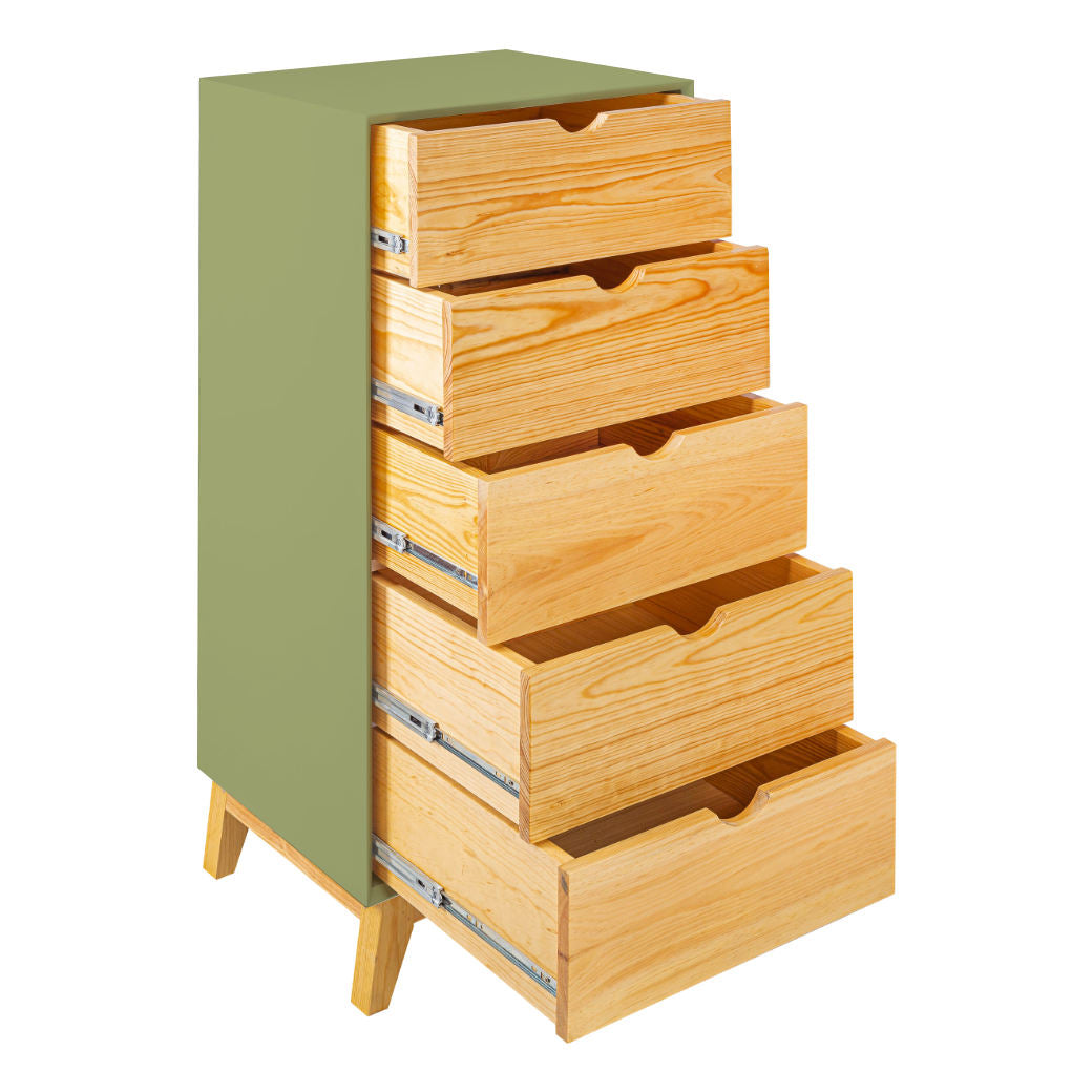 El Chiffonier Valencia es perfecto para mantener todo ordenado sin esfuerzo. Su diseño vertical aprovecha el espacio al máximo, con cajones en madera natural que aportan calidez y estilo al cuarto. Sus cinco cajones amplios y prácticos te permiten guardar ropa, accesorios o incluso juguetes, mientras que las patitas de madera elevan el mueble lo suficiente para que el espacio se vea más ligero y sea fácil limpiar. Disponible en 7 colores que combine con tu espacio y darle un toque personal.