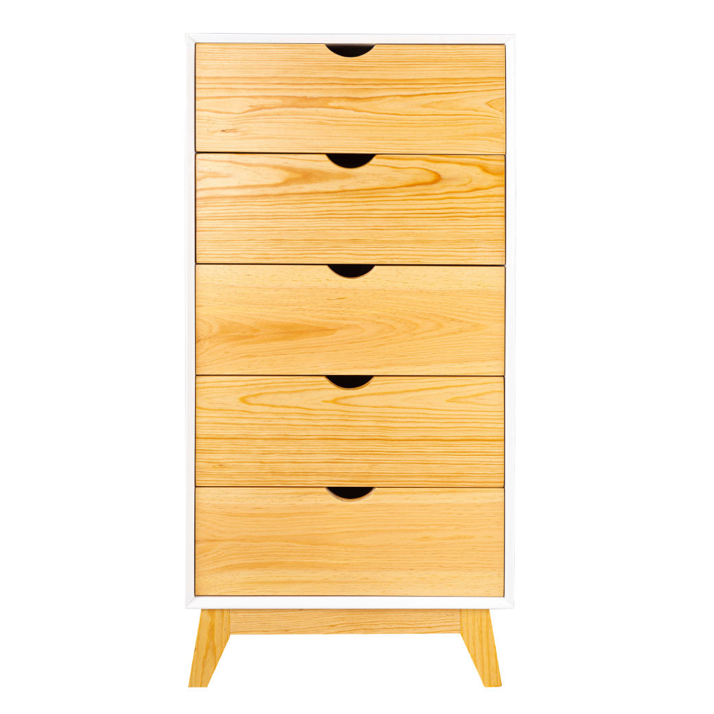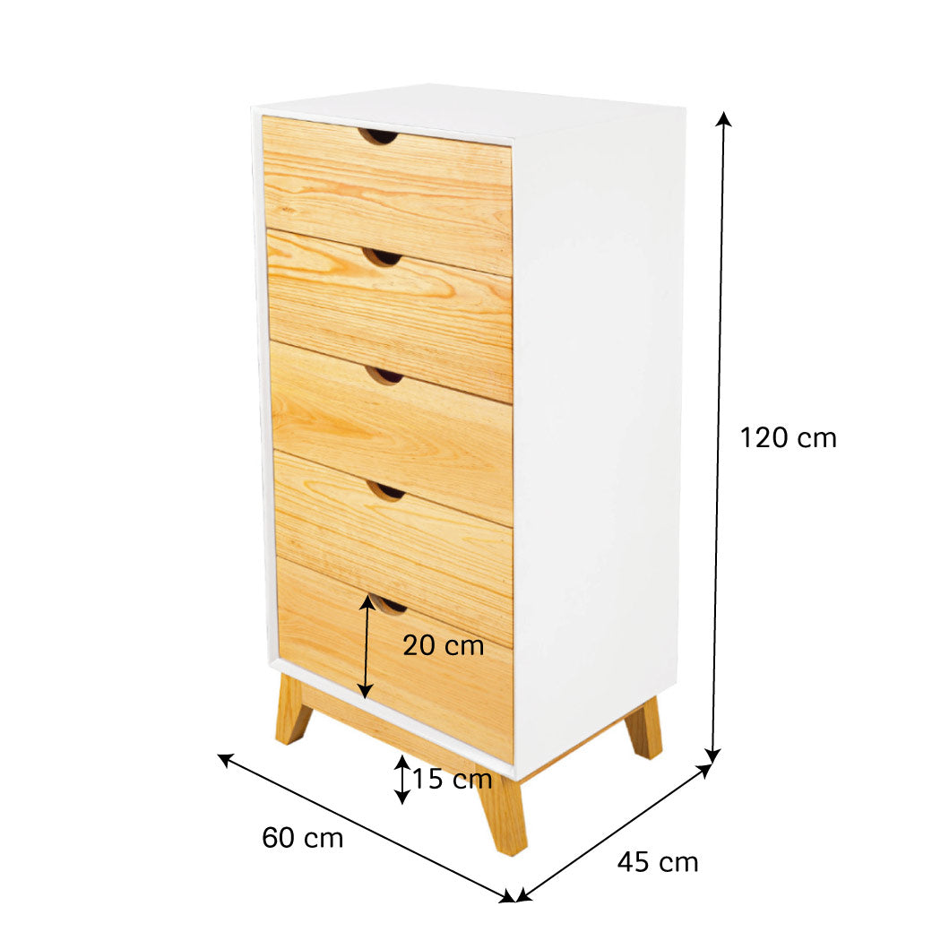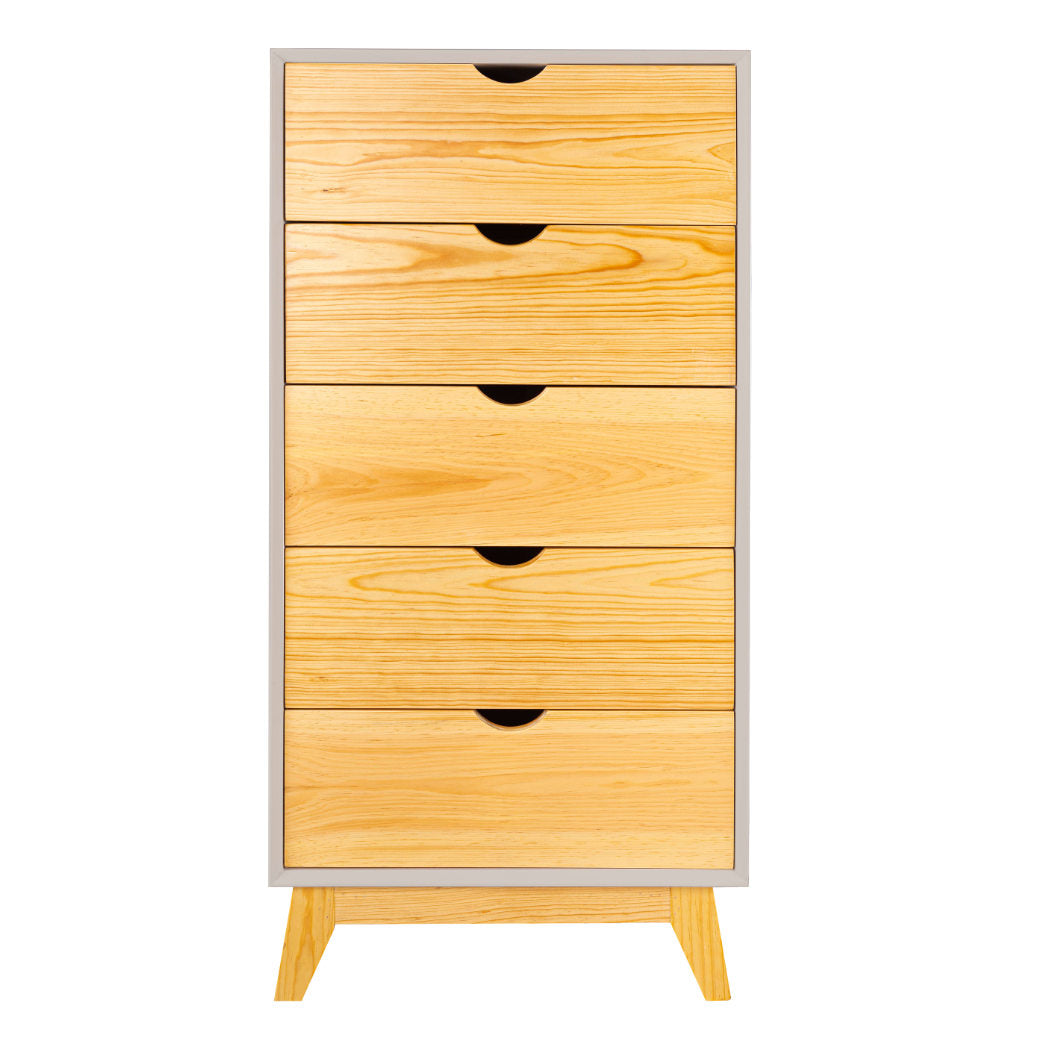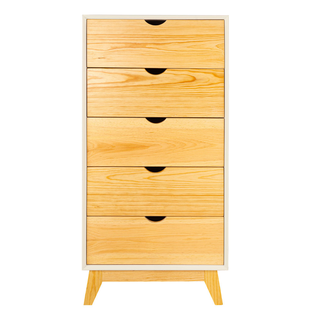 El Chiffonier Valencia es perfecto para mantener todo ordenado sin esfuerzo. Su diseño vertical aprovecha el espacio al máximo, con cajones en madera natural que aportan calidez y estilo al cuarto. Sus cinco cajones amplios y prácticos te permiten guardar ropa, accesorios o incluso juguetes, mientras que las patitas de madera elevan el mueble lo suficiente para que el espacio se vea más ligero y sea fácil limpiar. Disponible en 7 colores que combine con tu espacio y darle un toque personal.